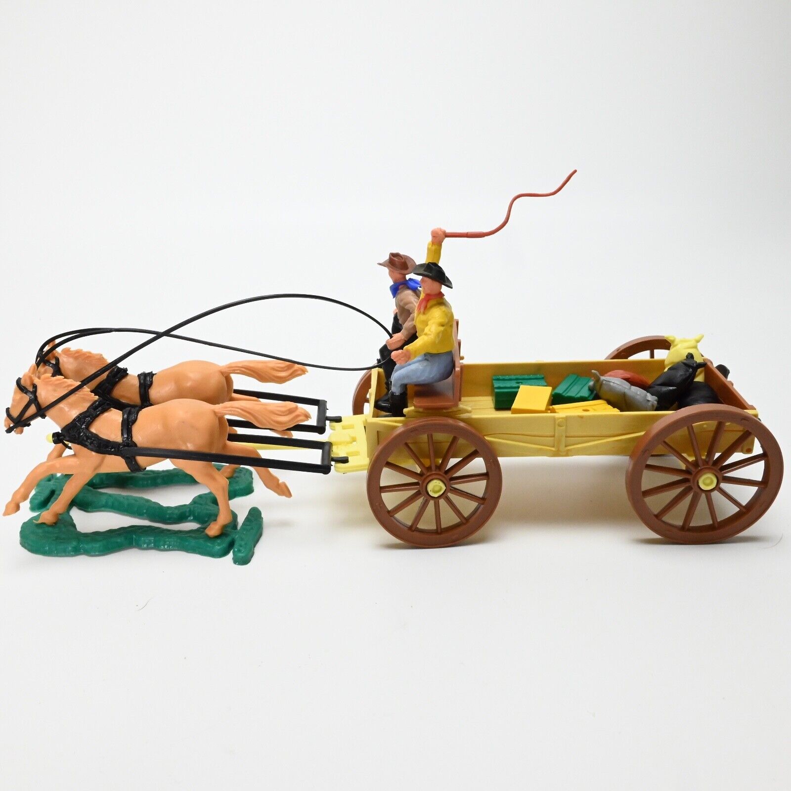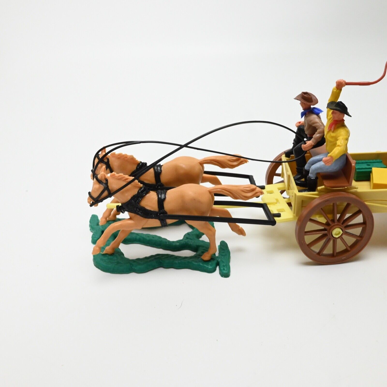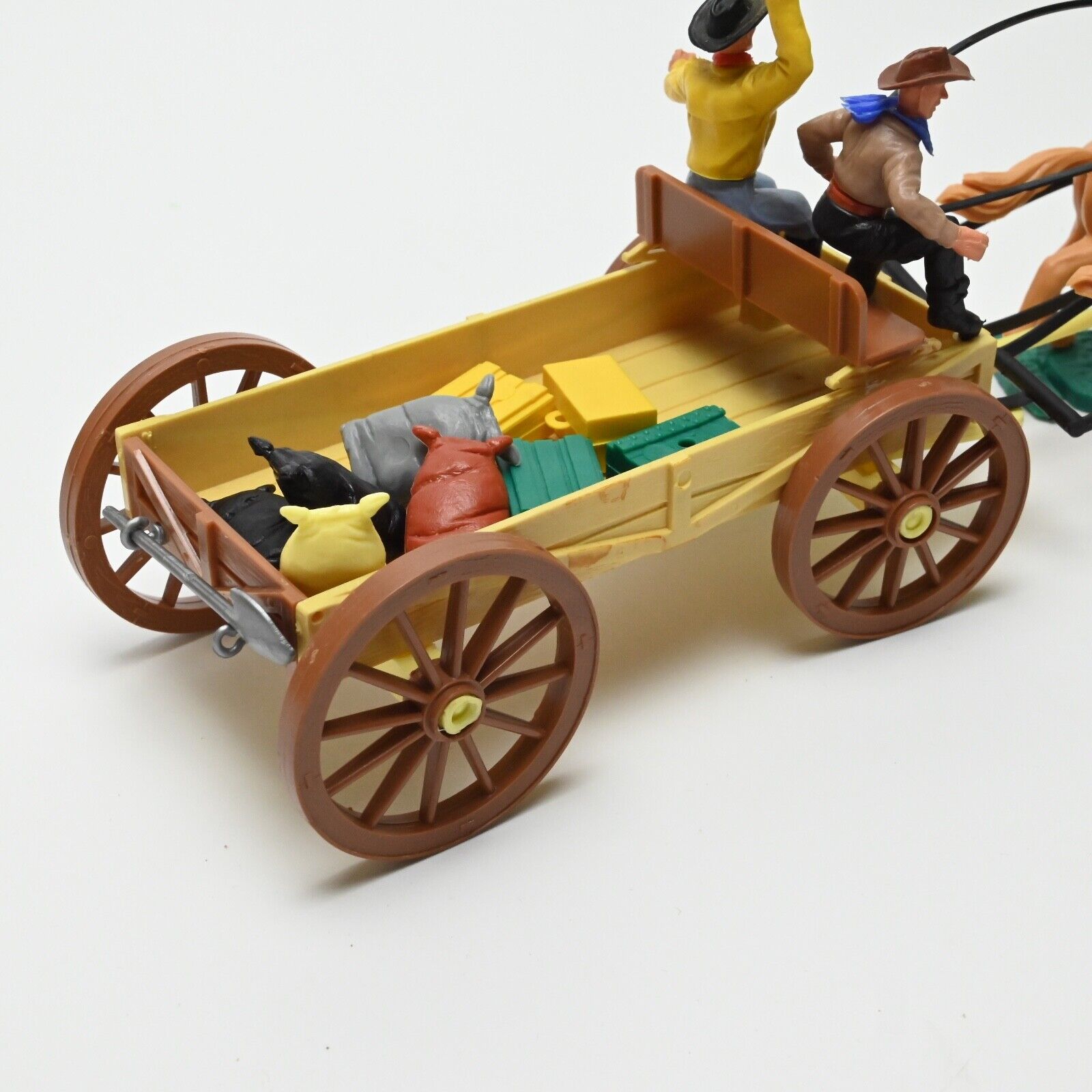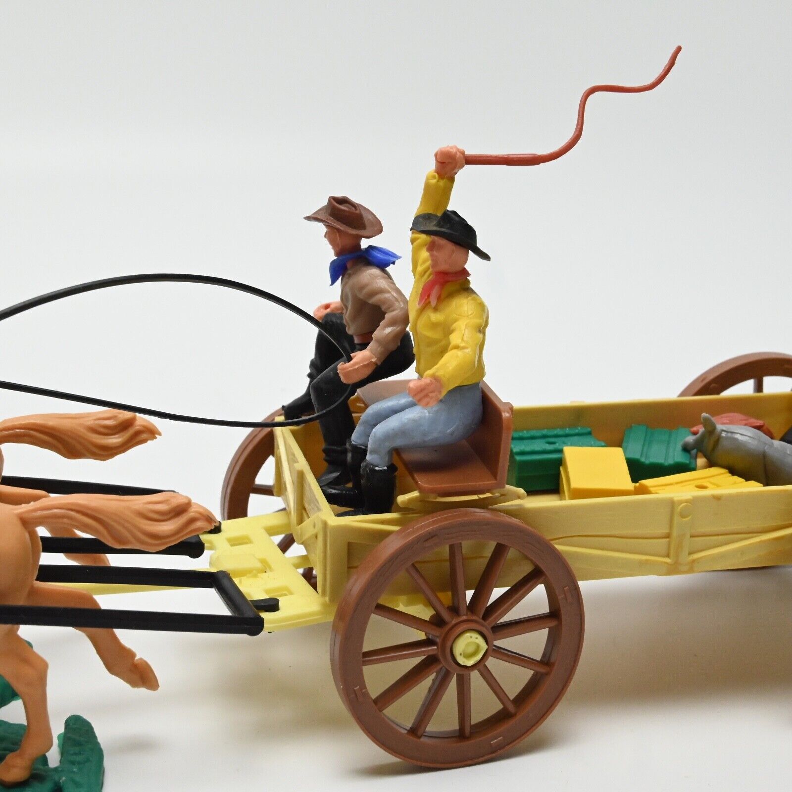 Ausgabe von 1972, bestehend aus: 2 x Pferdegespann, 2 x Kutscher und Buckboard (sandgelbe Variante) mit Zubehör in insgesamt ausgezeichnetem bis nahezu neuwertigem Zustand, in einer guten Set-Box; Zellophan zerknittert mit einem kleinen Loch und einigen Quetschschäden/Lagerspuren