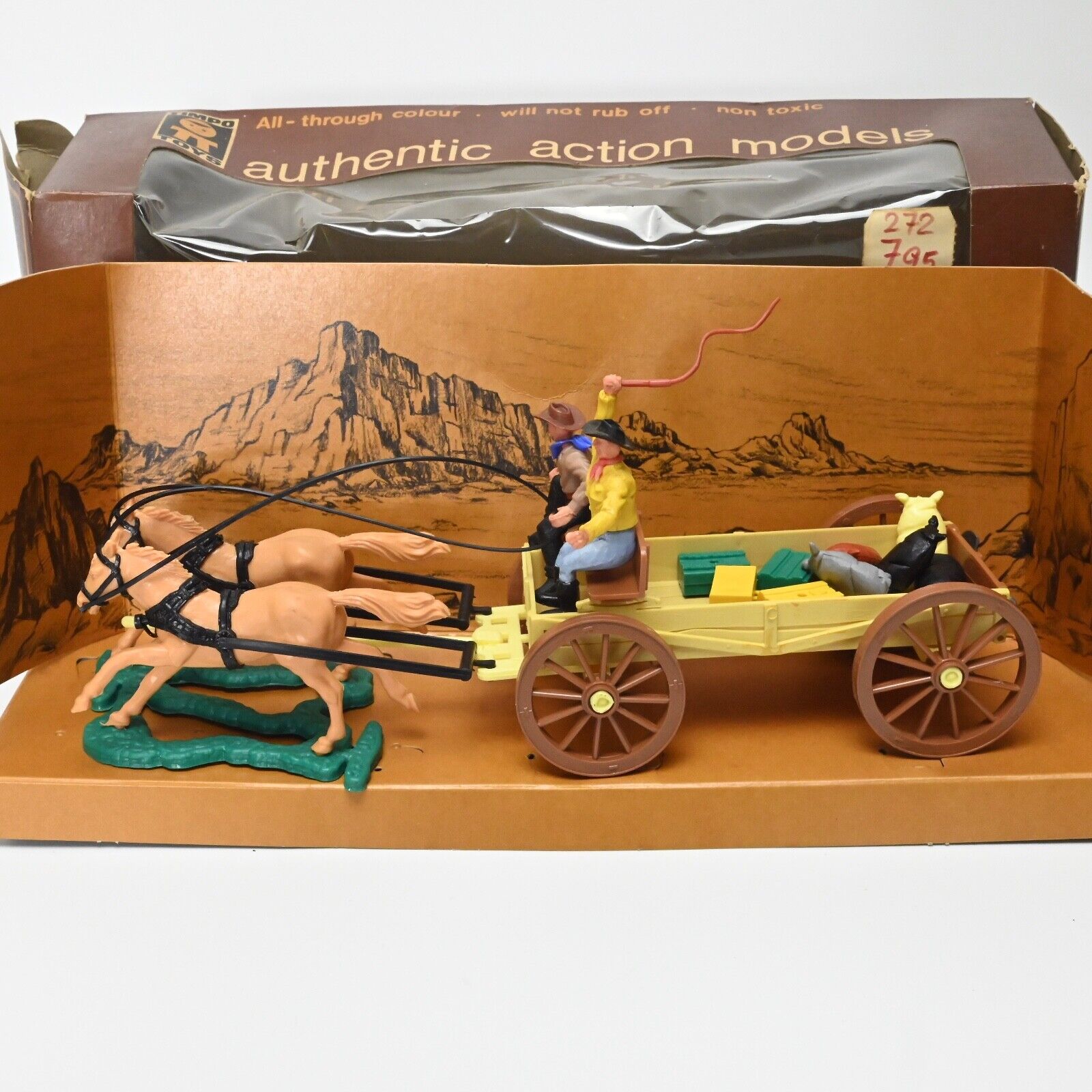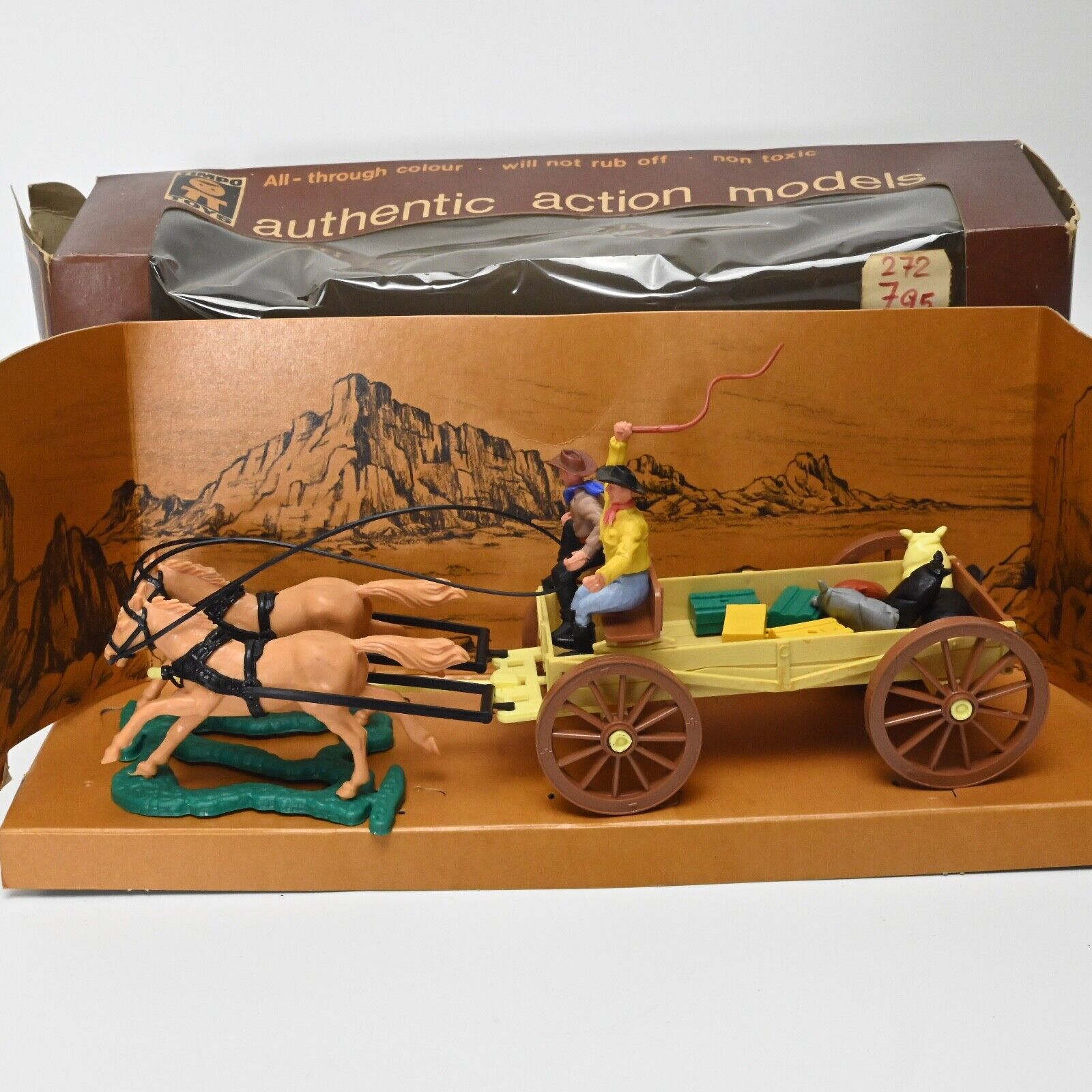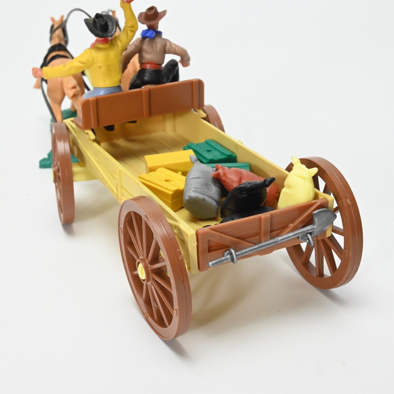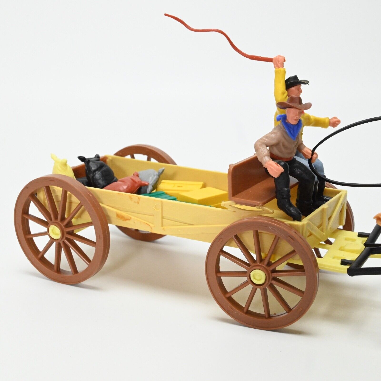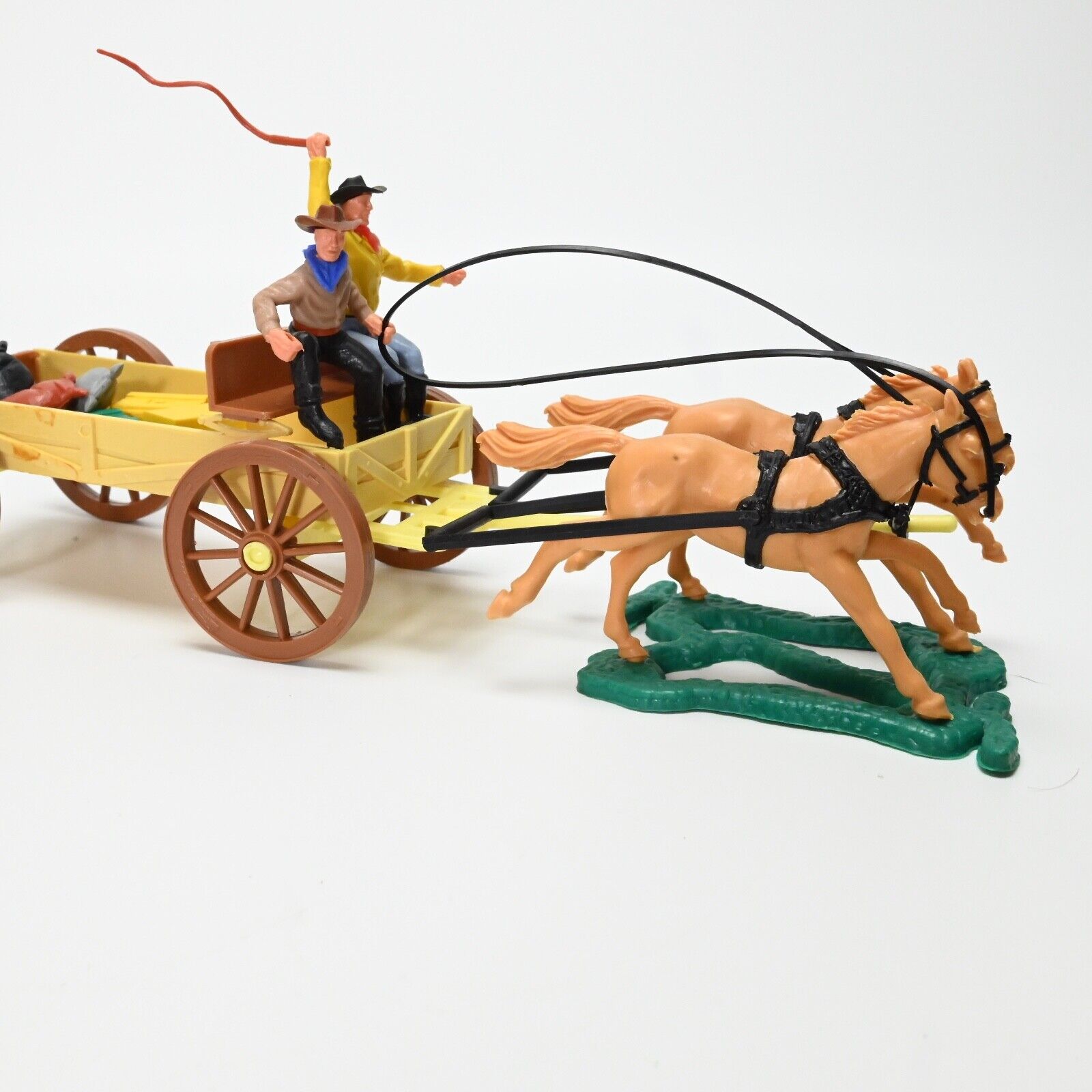 Ausgabe von 1972, bestehend aus: 2 x Pferdegespann, 2 x Kutscher und Buckboard (sandgelbe Variante) mit Zubehör in insgesamt ausgezeichnetem bis nahezu neuwertigem Zustand, in einer guten Set-Box; Zellophan zerknittert mit einem kleinen Loch und einigen Quetschschäden/Lagerspuren