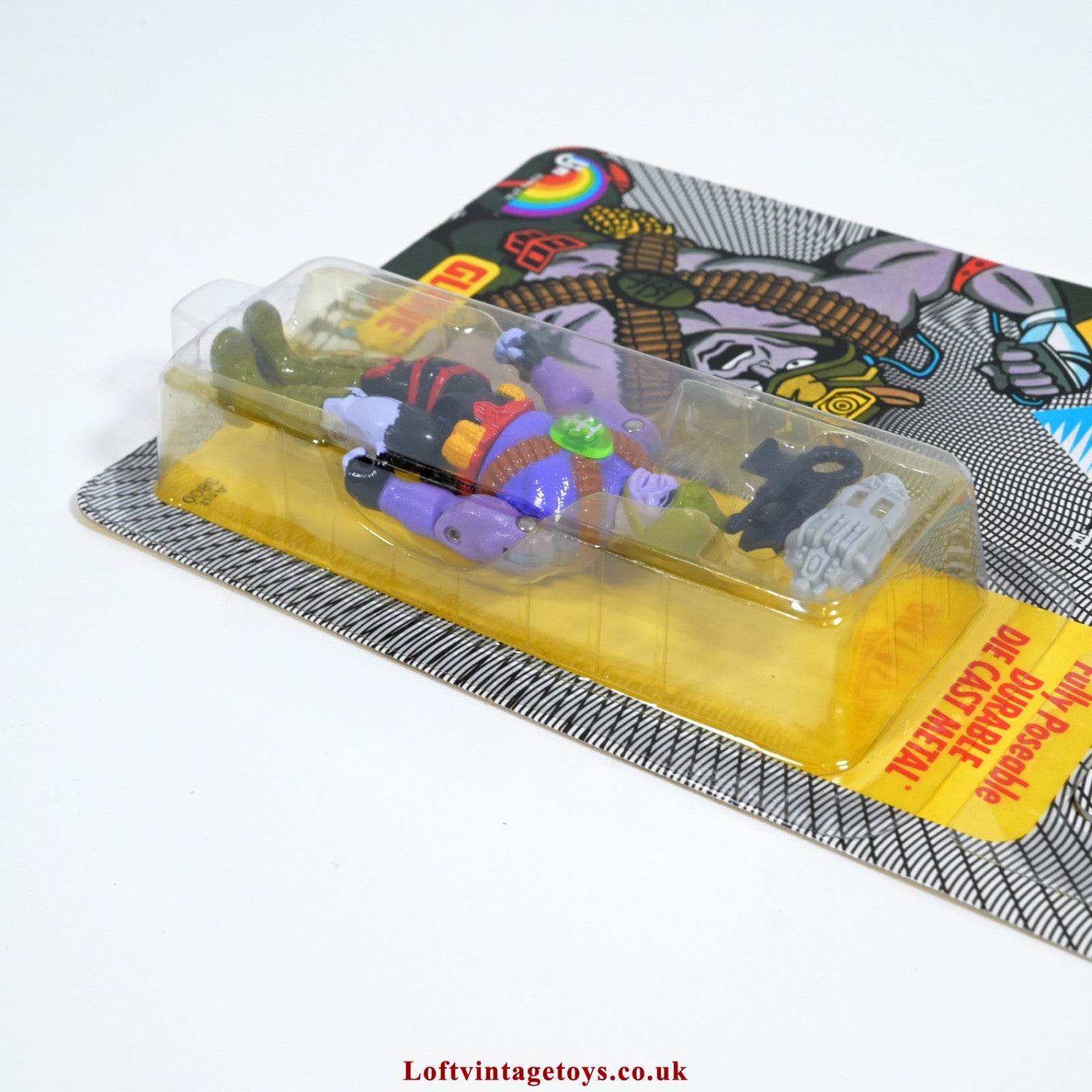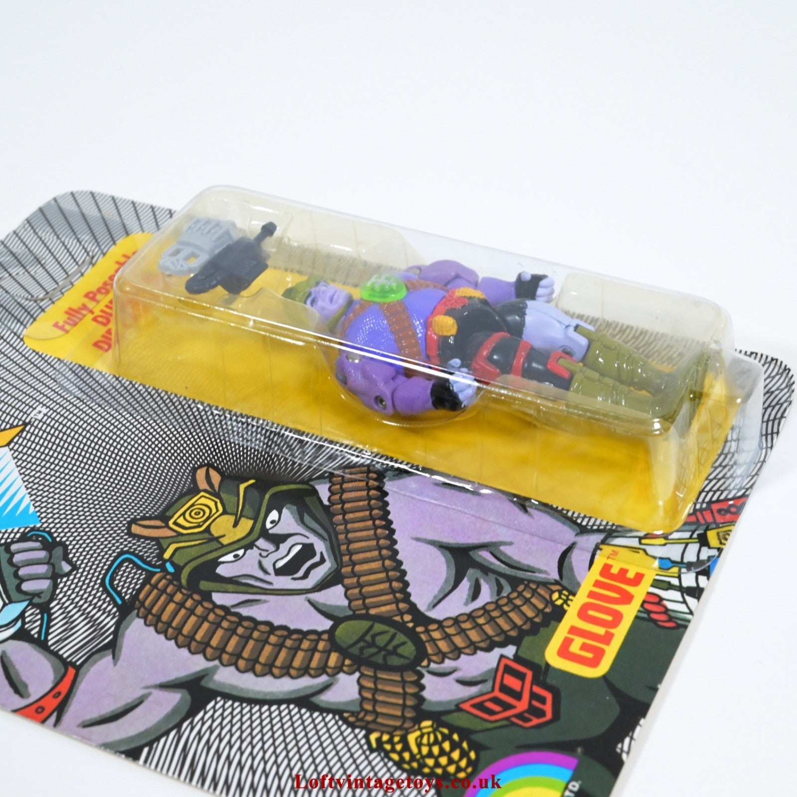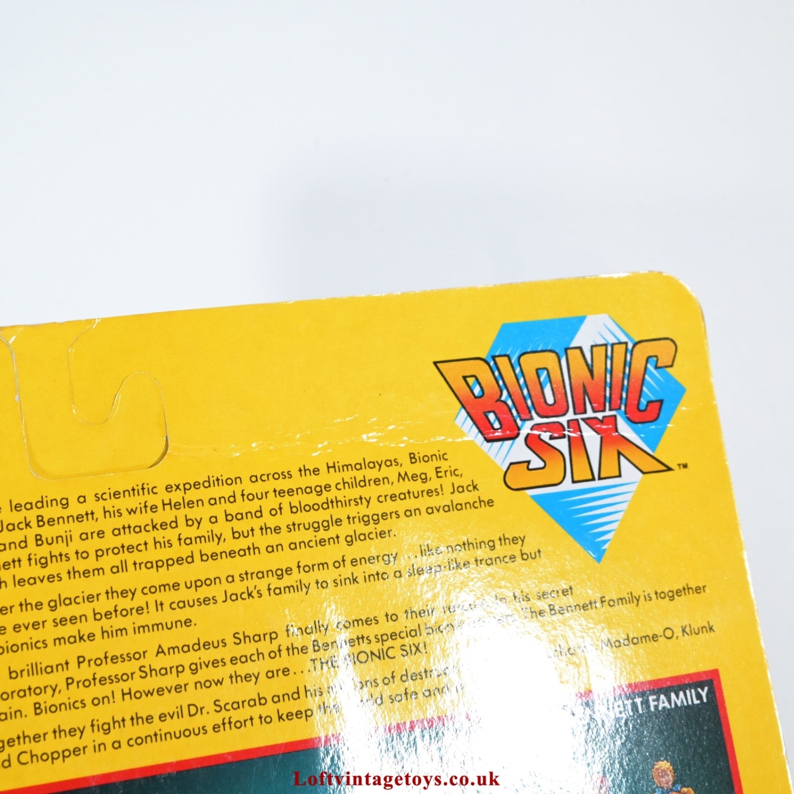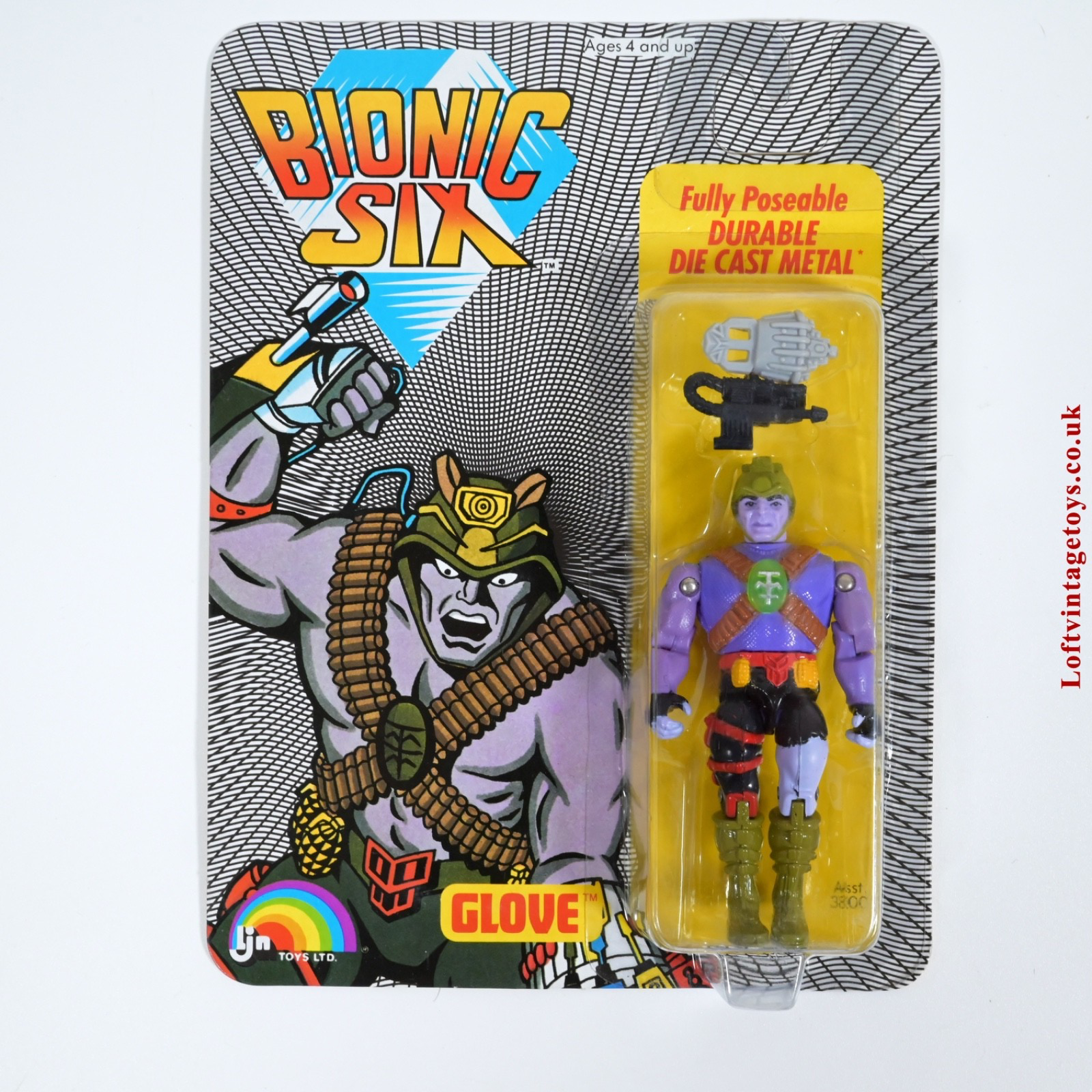 Bionic six Glove die cast figure on an Excellent backing card; several light creasing lines, Excellent fully sealed slightly yellowed bubble; some scuffing.