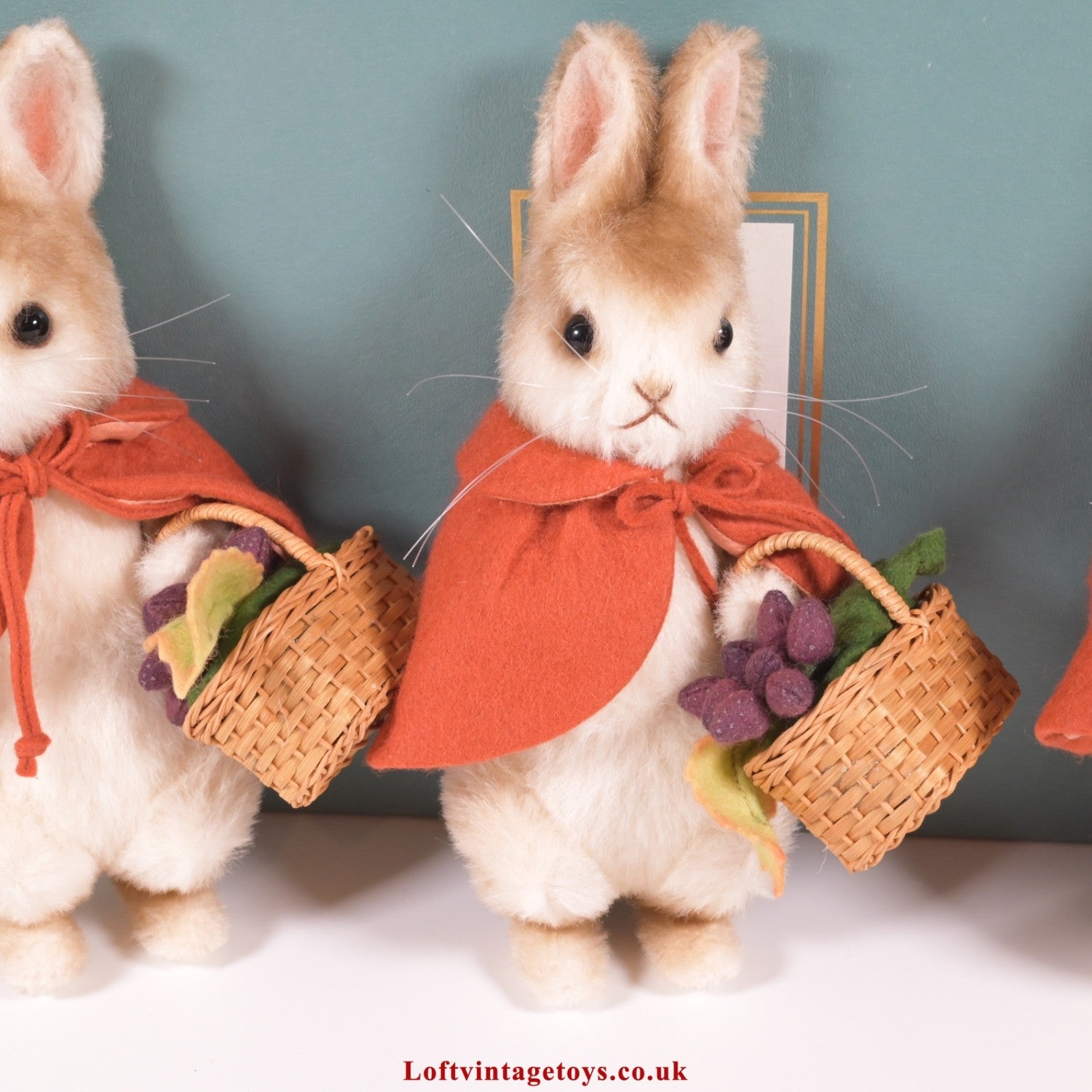 Each 8" tall, fully jointed, made of mohair plush with embroidered features and glass eyes. Wearing felt capes and carrying baskets filled with felt blackberries. Complete with certificate, with a limited edition no. 246 of 500, in mint condition, within a mint box.
