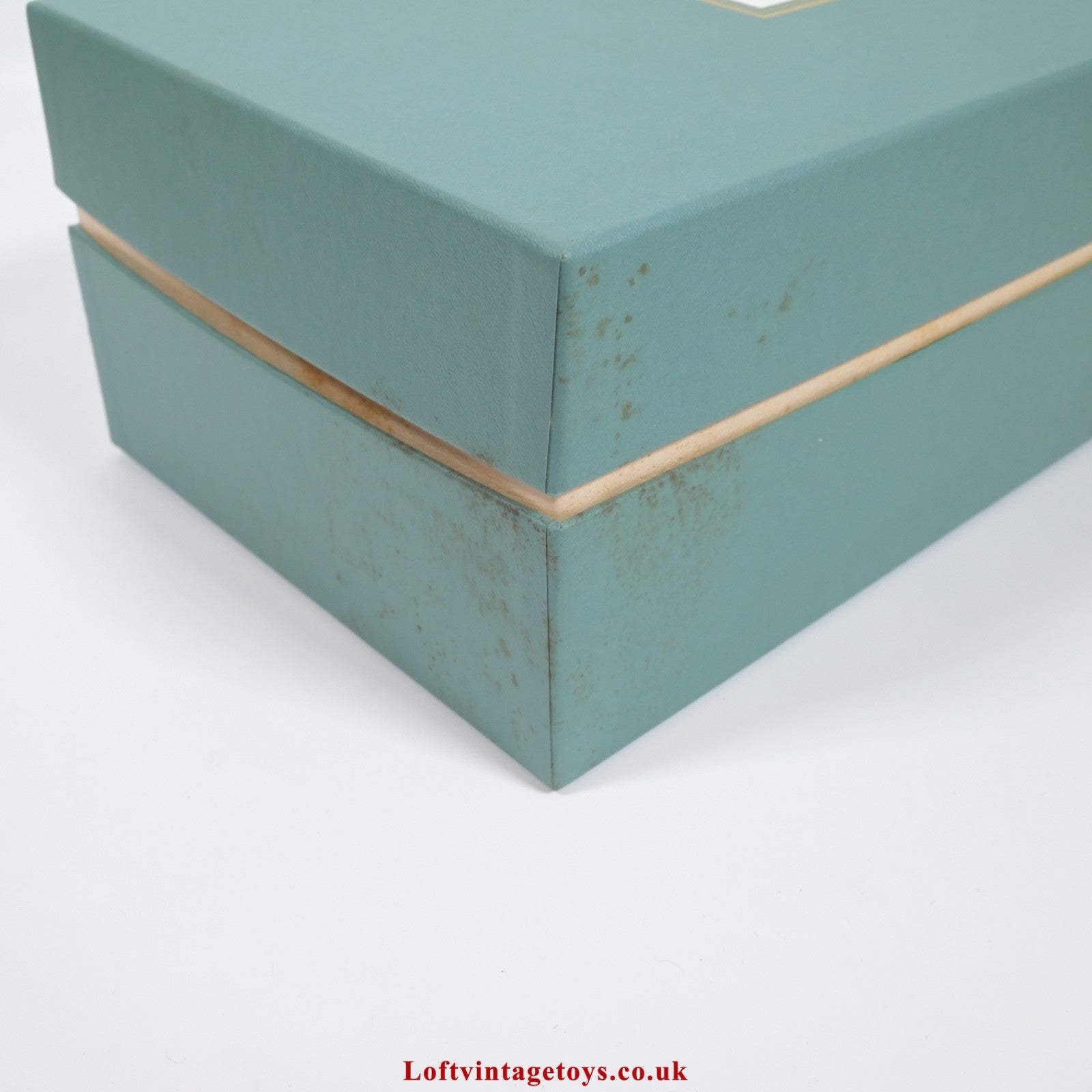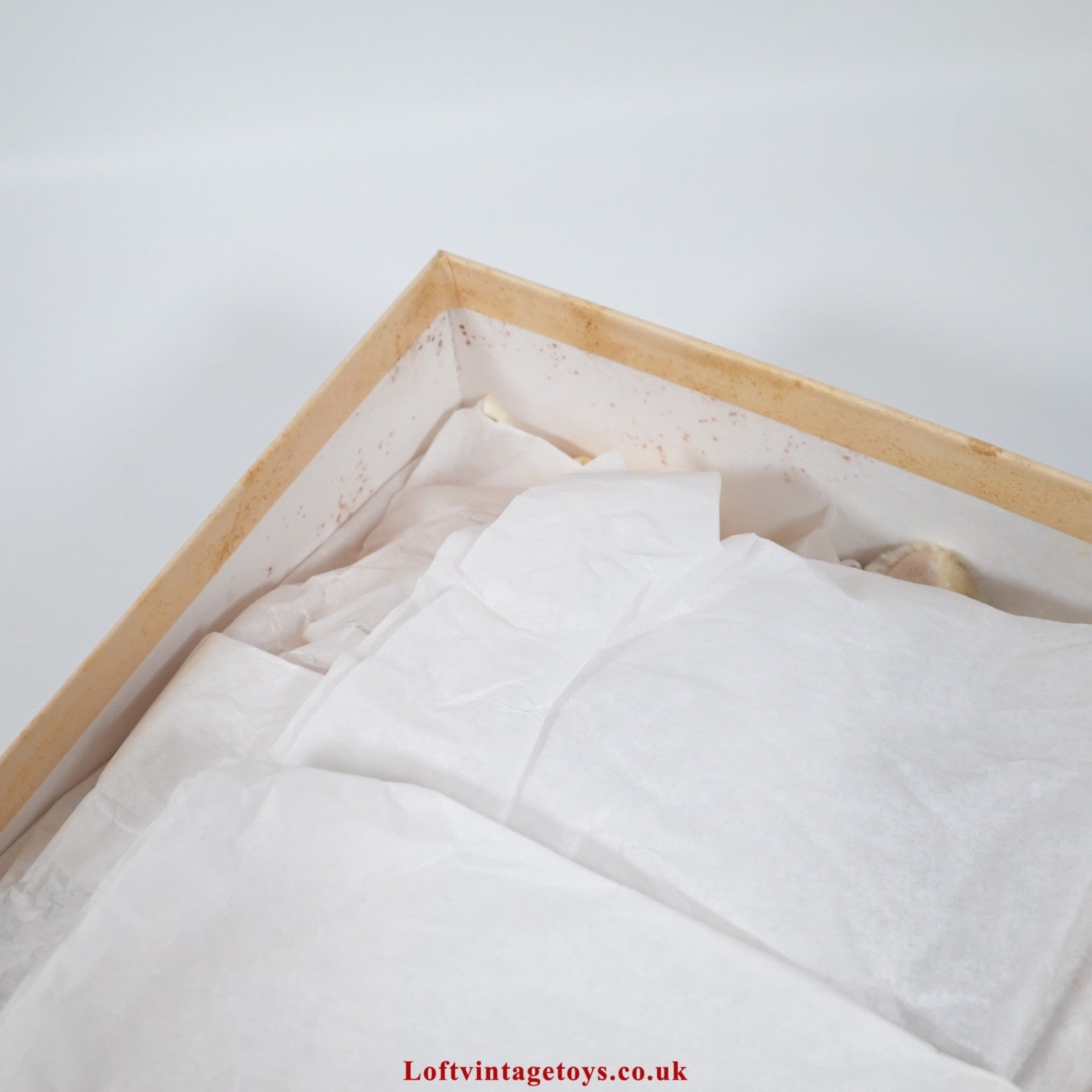 12" tall, fully jointed, made of mohair plush with embroidered features and glass eyes, wearing a striped felt underskirt, cotton dress and apron, a cotton gauze neckerchief, leather slippers with brass buckles. Includes handmade straw broom, limited edition no. 62 of 500, in Excellent condition, with box (suffers from foxing, which as entered inside the box - please see pics), original tag and COA.