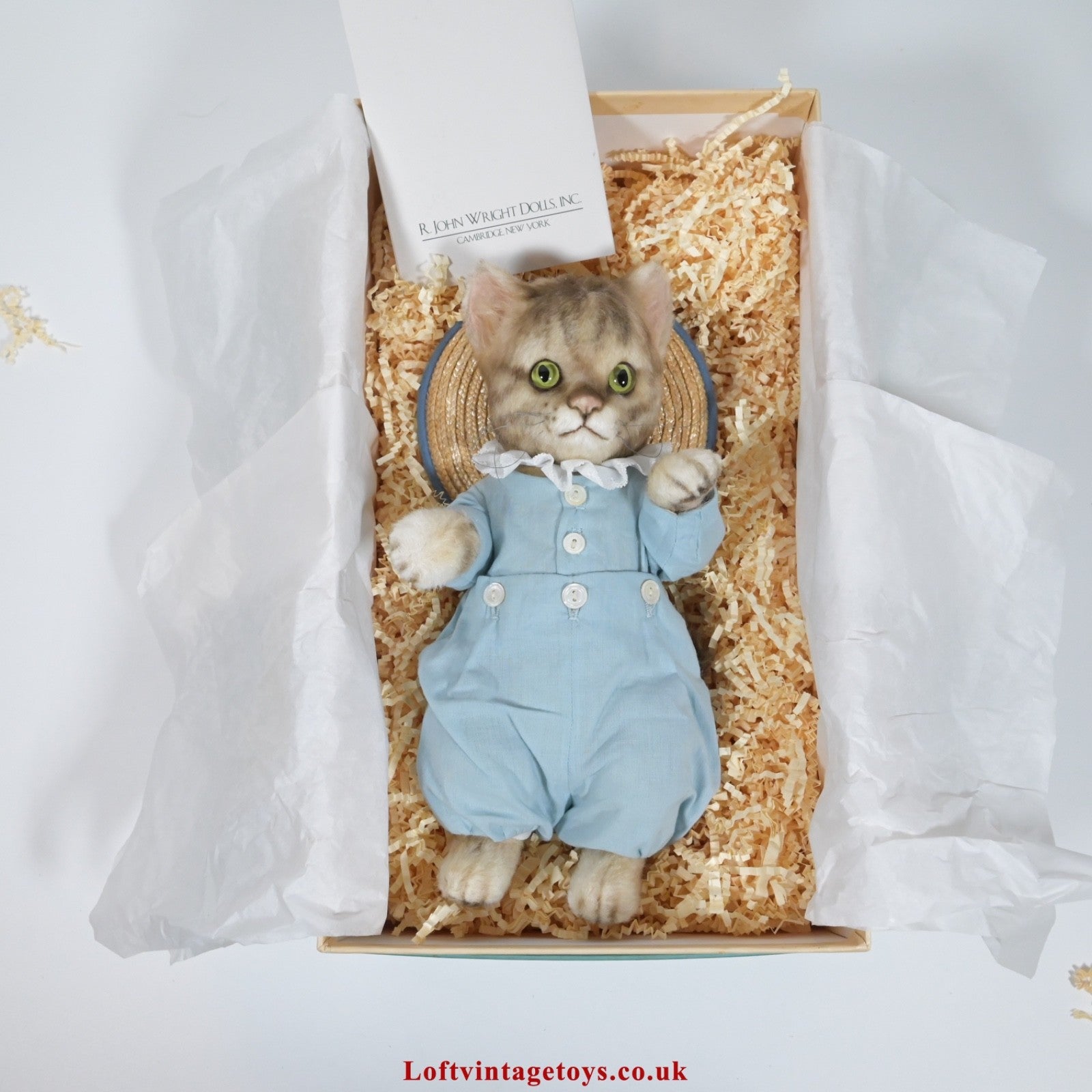 11" tall, fully jointed, made of mohair plush with embroidered features, felt paw pads, glass eyes, wearing a two-piece cotton romper, lace tucker, felt-trimmed straw boater, limited edition no. 1184 of 1500, in Excellent condition with just some slight rusting on the RJW button leaving a minor mark on the romper outfit around the button. Metal stand as tarnished leading to some rusting on this as well - please see pics. Includes box (suffers from foxing, which as entered inside the box), swing tag and COA.