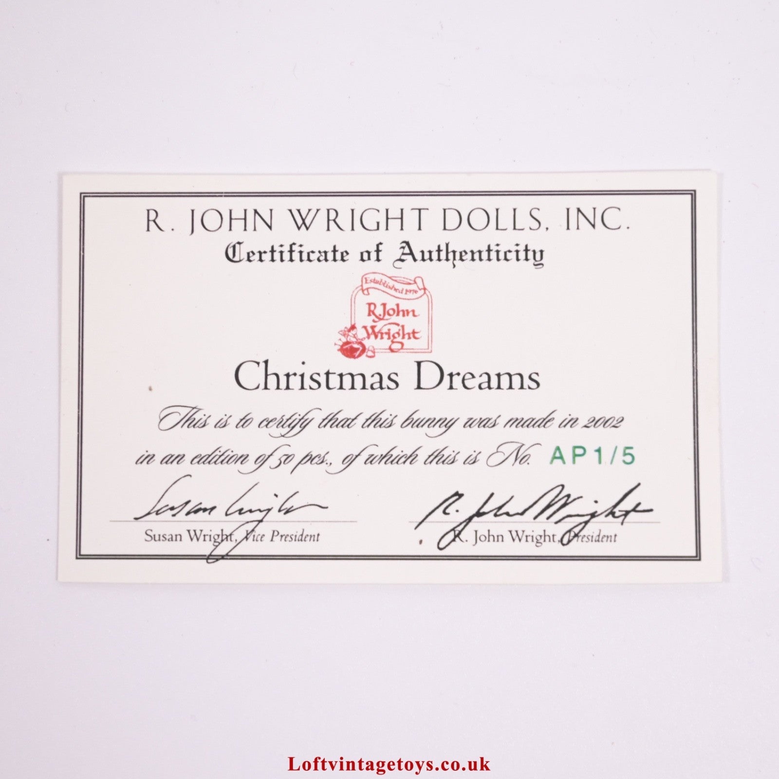 Christmas Dreams Artist proof edition 1 of 5, fully jointed, with swing tag label signed to "Mary Ann" by R J wright, in Excellent condition, includes box (with some light foxing and staining which can be seen on the inside of the box) and COA