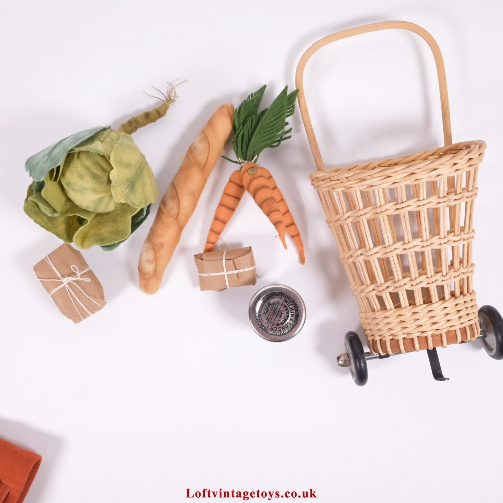 including pull a long shopping trolley with baguette, marmalade, carrots and other items, a dark orange felt coat, scarf and hat, in Excellent condition, includes original box (slight fading to box, some creasing/wear to lid) and certificate.
