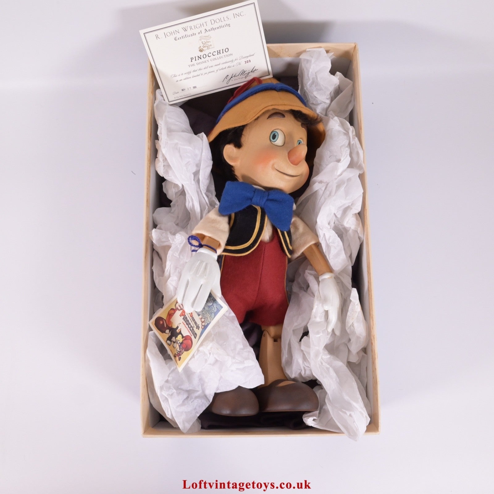 limited edition no. 309 of 500, produced exclusively for Disneyland, larger 16" Alpine maple version, fully jointed, hand-painted, all felt costume, in Excellent condition, includes box (does suffer from foxing which is clearly visible inside the box - please see pics), original swing tag and COA.