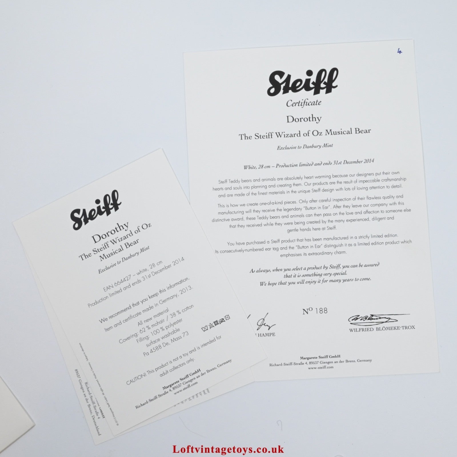 Steiff Wizard of Oz musical Dorothy teddy bear, Limited Edition production ended 31 December 2014, mohair, working key wound integral music box plays Somewhere Over the Rainbow (tarnished metal key), some very light discolouration/stain on her white shirt (this can only be seen at very close inspection) otherwise Excellent condition, with certificate and Steiff box.