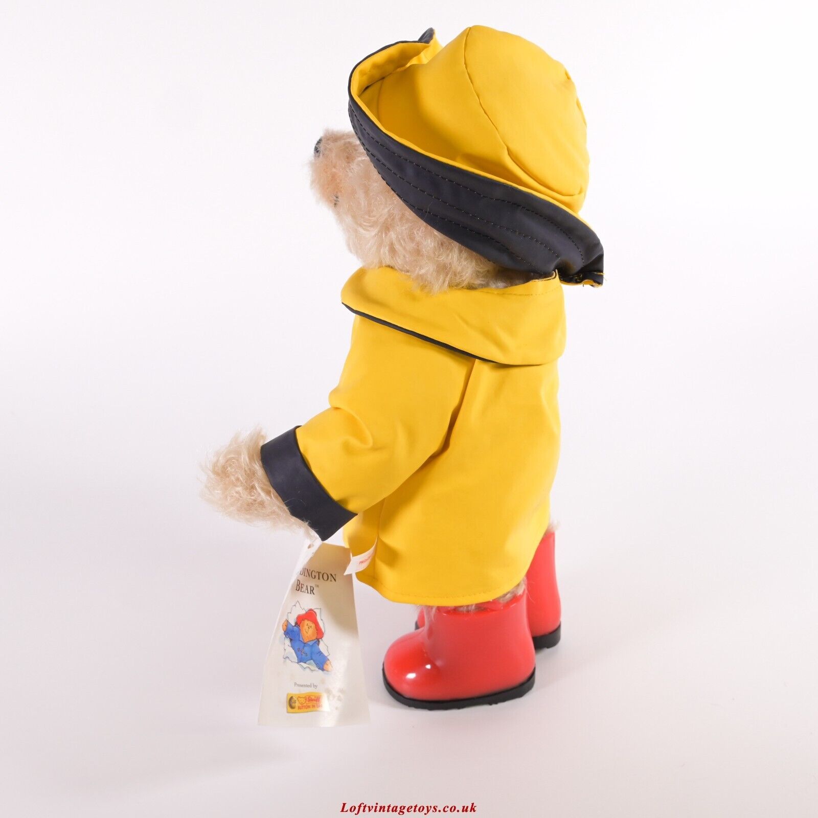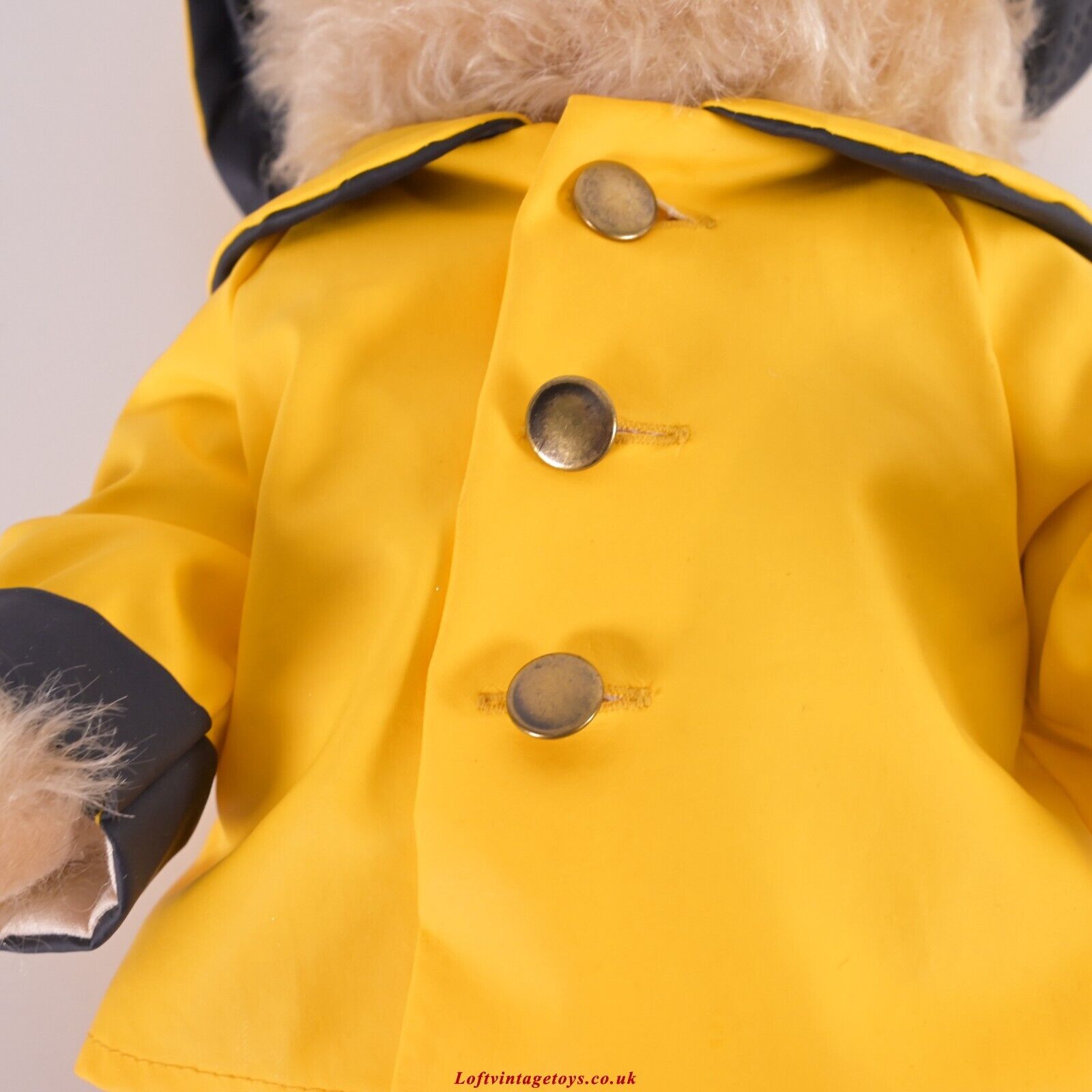 from 2005, blonde mohair teddy bear, wearing yellow and black mackintosh and red wellington boots, in Near Mint to Mint condition, with swing label certificate (some light staining), includes Near Mint to Mint box & display stand, includes outer trade carton.