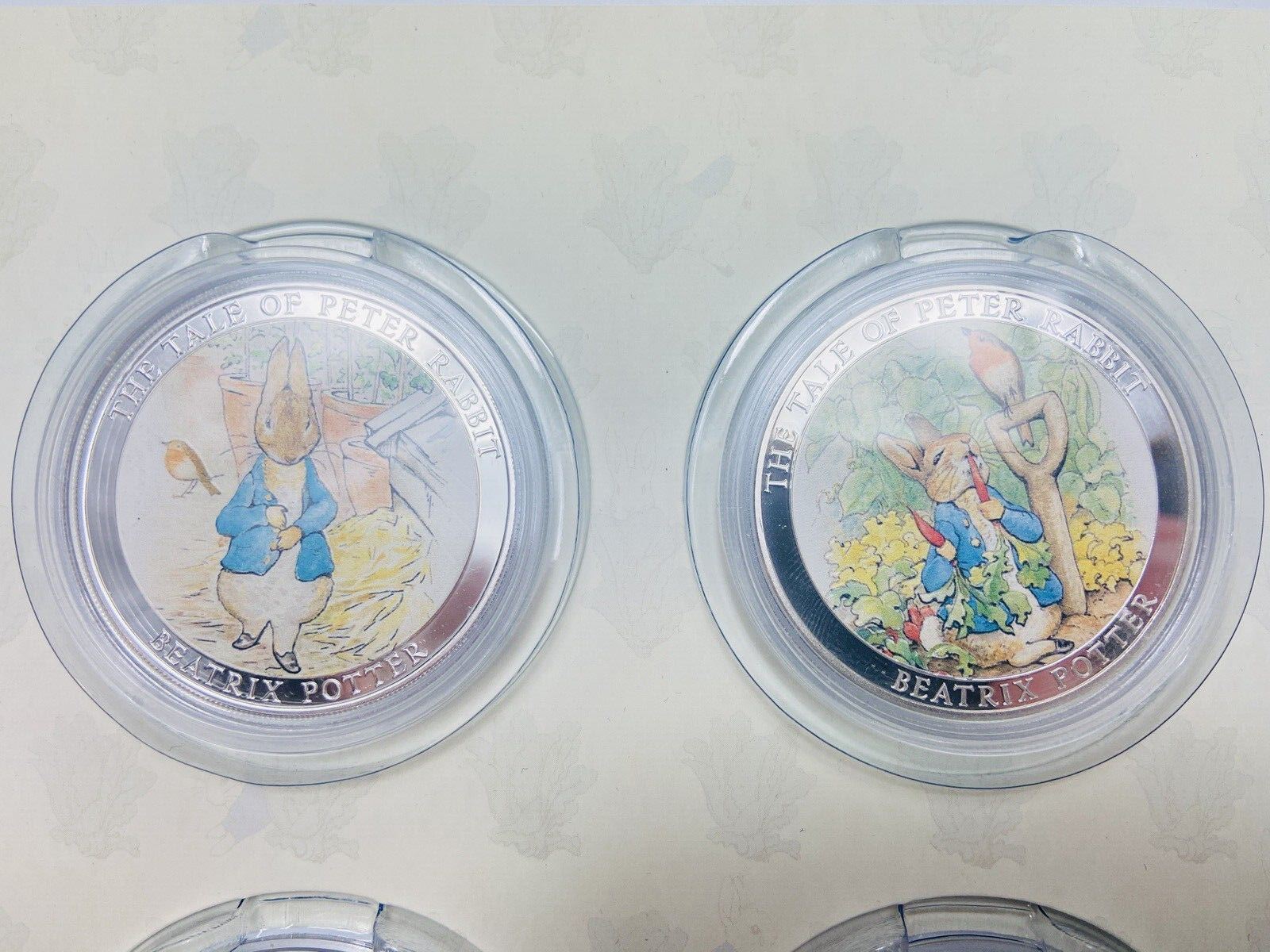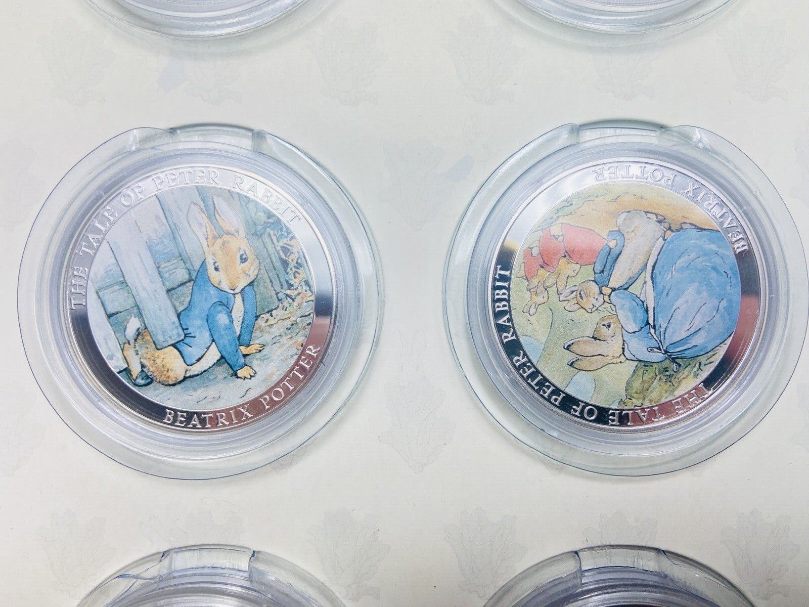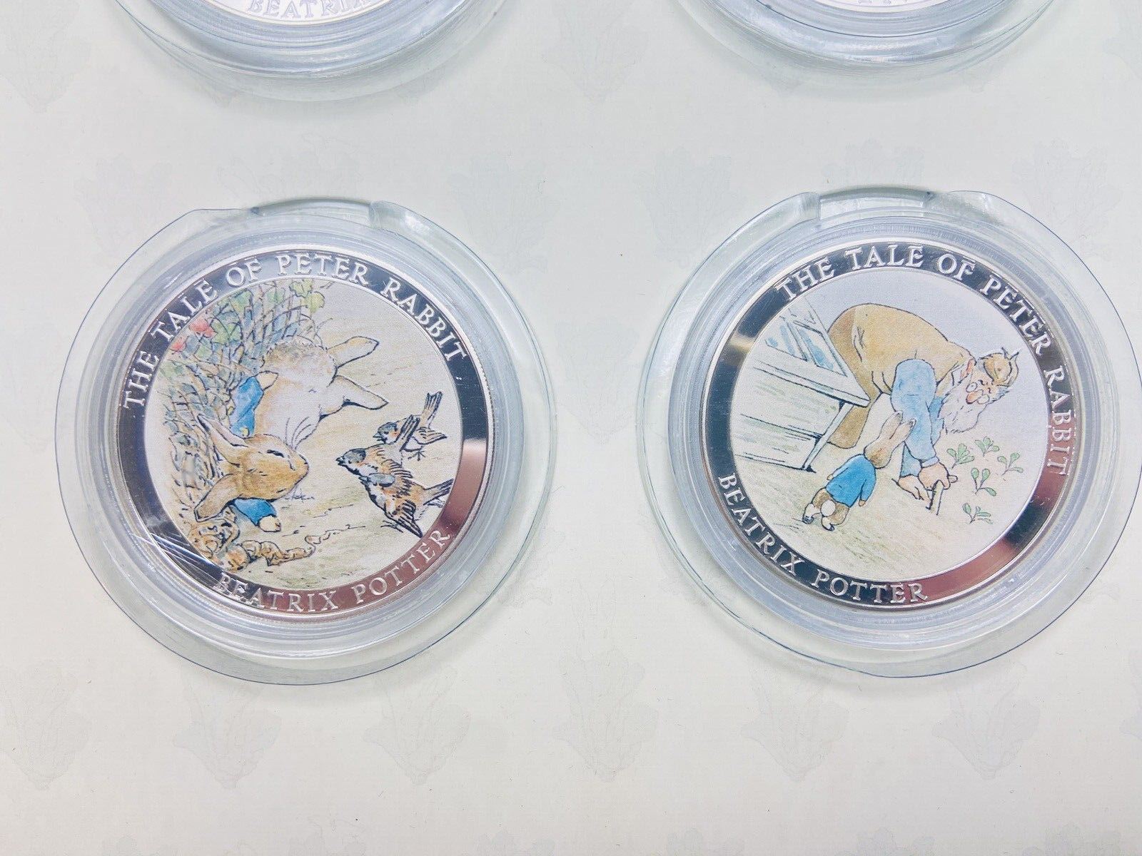 six silver plated coins with different Peter Rabbit scenes on each in Mint condition.